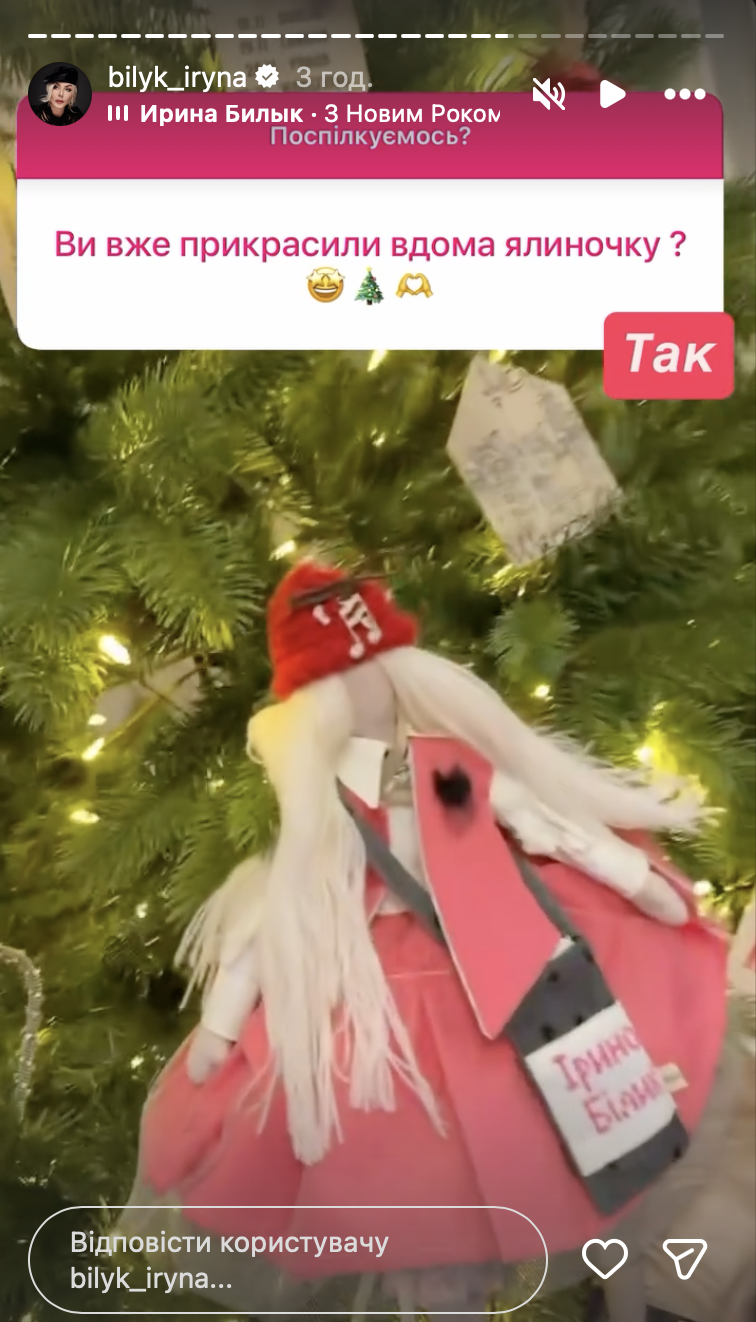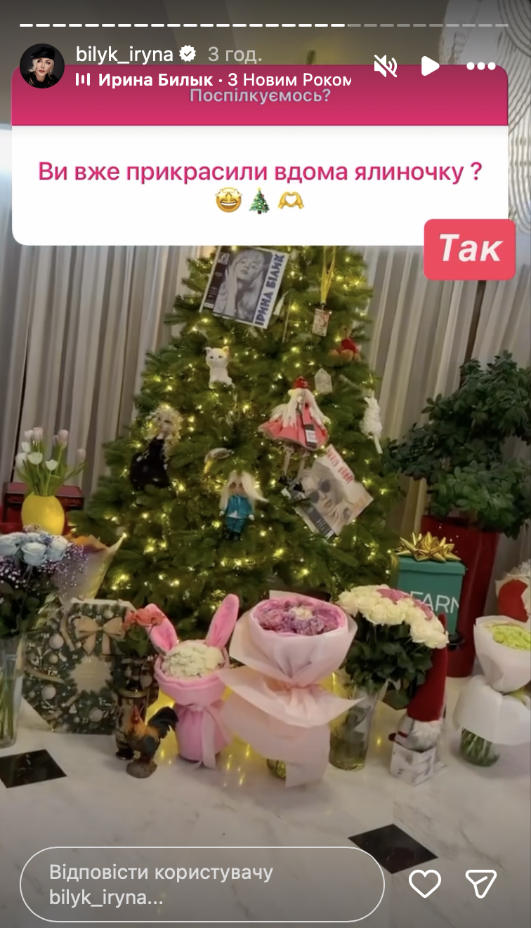 На что Билык ответила, что да, и даже показала праздничное дерево. Возле елки певицы стоят куча букетов от фанатов и подарки. А на самом дереве висят игрушки, на одной из которых пишет "Ирина Билык", а другая — в виде белого котика. Вероятно, это также подарок поклонников.
