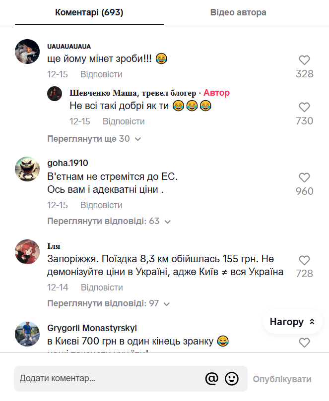 "Вьетнам не стремится в ЕС. Вот вам и адекватные цены", — пишет один из участников обсуждения. Другой добавил: "Запорожье. Поездка 8,3 км обошлась в 155 грн. Не демонизируйте цены в Украине, ведь Киев не равен всей Украине".