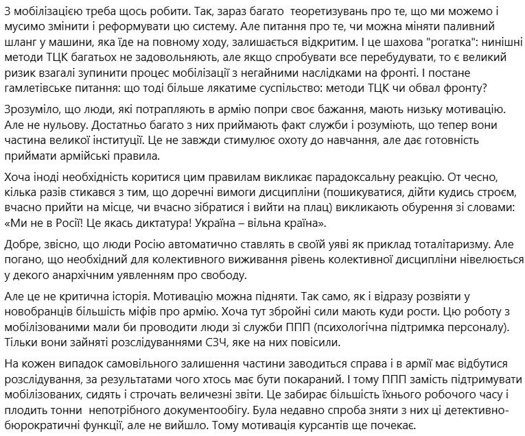 "Понятно, что люди, которые попадают в армию вопреки своему желанию, имеют низкую мотивацию. Но не нулевую. Достаточно многие из них принимают факт службы и понимают, что теперь они часть большого института. Это не всегда стимулирует желание к обучению, но дает готовность принимать армейские правила", — написал Вадим Карпьяк.