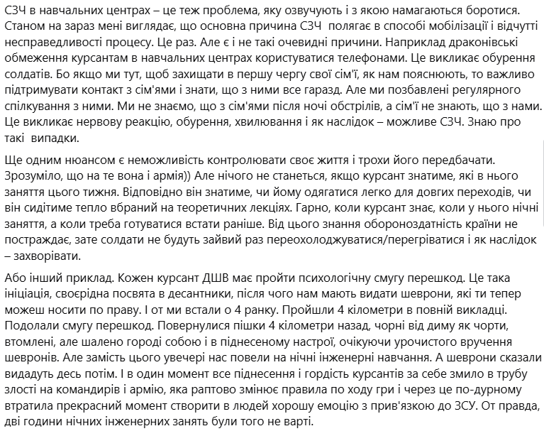 Он также высказался о проблеме самовольного оставления частей и отметил, что основными причинами этого явления считает способы мобилизации и ощущение несправедливости процесса у военнообязанных. Кроме того, по словам военного, к СОЧ побуждают "драконовские ограничения" на использование телефонов в учебных центрах.