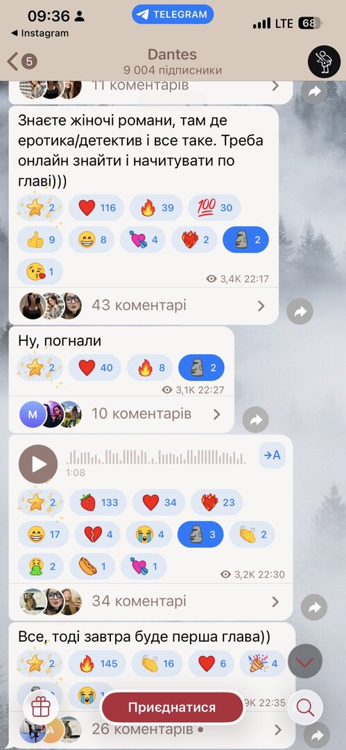 Книжный блогер из Винницы Анастасия "Owl's reading vibes" заявила, что ее заблокировал Дантес. Она рассказала, что перед этим осудила загрузки книг онлайн и их озвучивание в Telegram. Скриншоты сообщений в канале певца, которые предшествовали ситуации, она опубликовала в Threads.