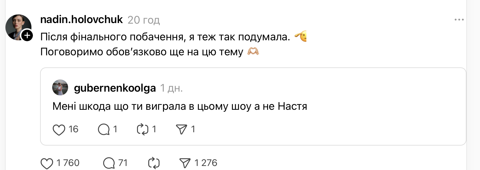 - "Финал "Холостяка" выглядит так, будто Тарас уже понимал, что выберет Надин и, что свидание с Настей последнее, поэтому решил взять от него все и "поюзать" Настю по максимуму... Гадко как-то. Настя шикарная женщина и заслуживает лучшего", — опубликовала свое мнение другая.