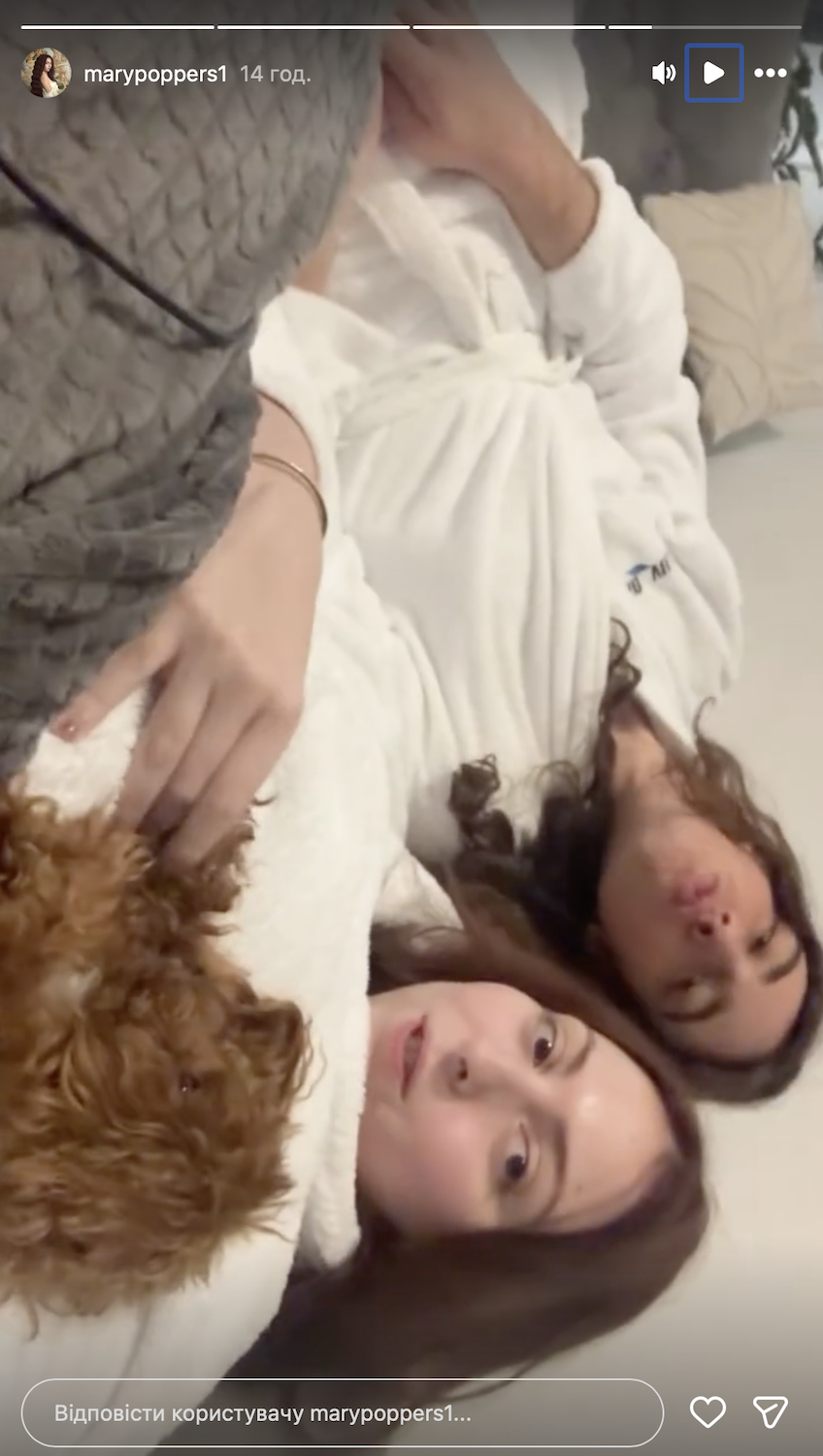 Маша Полякова поделилась нежным видео, на котором проводит время вместе с мужем в постели. Пара отдыхает в белых халатах, наслаждаясь спокойной атмосферой после активного дня, а рядом с ними — пушистый любимец.