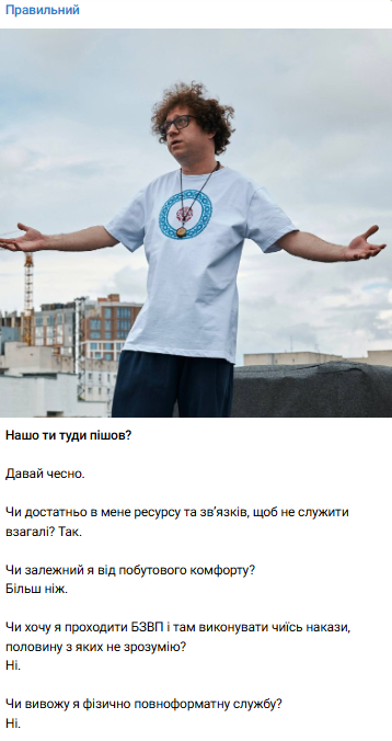 "Я бывал во многих странах, в некоторых даже посчастливилось по несколько месяцев пожить. То есть есть есть с чем сравнить Украину и, честно, я не знаю что здесь должно произойти, чтобы я поехал", — объяснил Миша Правильный свое решение мобилизоваться по собственному желанию.