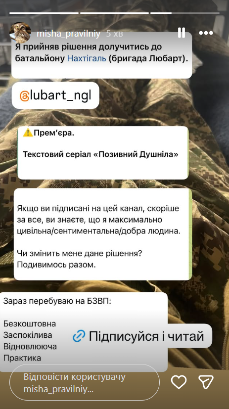 О своей мобилизации Миша Правильный сообщил 13 января на странице в Telegram. По его словам, он принял решение присоединиться к батальону беспилотных систем "Нахтигаль" 20-й бригады оперативного назначения "Любарт" 1-го корпуса Национальной гвардии Украины "Азов".