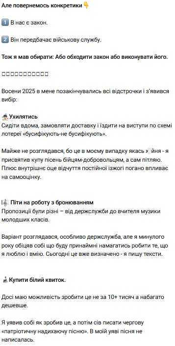Он отметил, что должен был мобилизоваться по закону Украины и не хотел "уклоняться, сидеть дома, заказывать доставку и ездить на выступления по схеме лотереи "бусифицируют-не бусифицируют". Рэпер отметил, что посвятил немало своих треков военным-добровольцам.