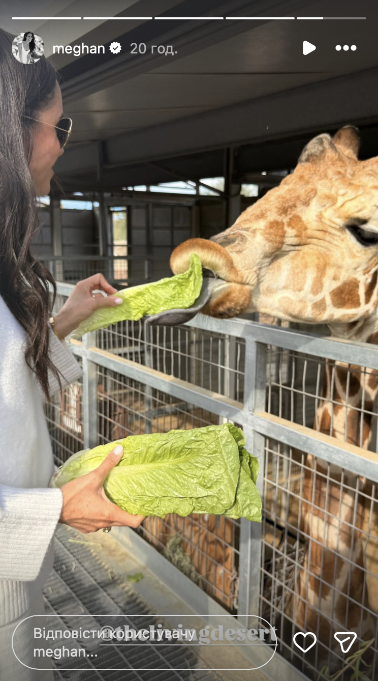 Тем временем сама Меган Маркл покормила жирафа в зоопарке.
