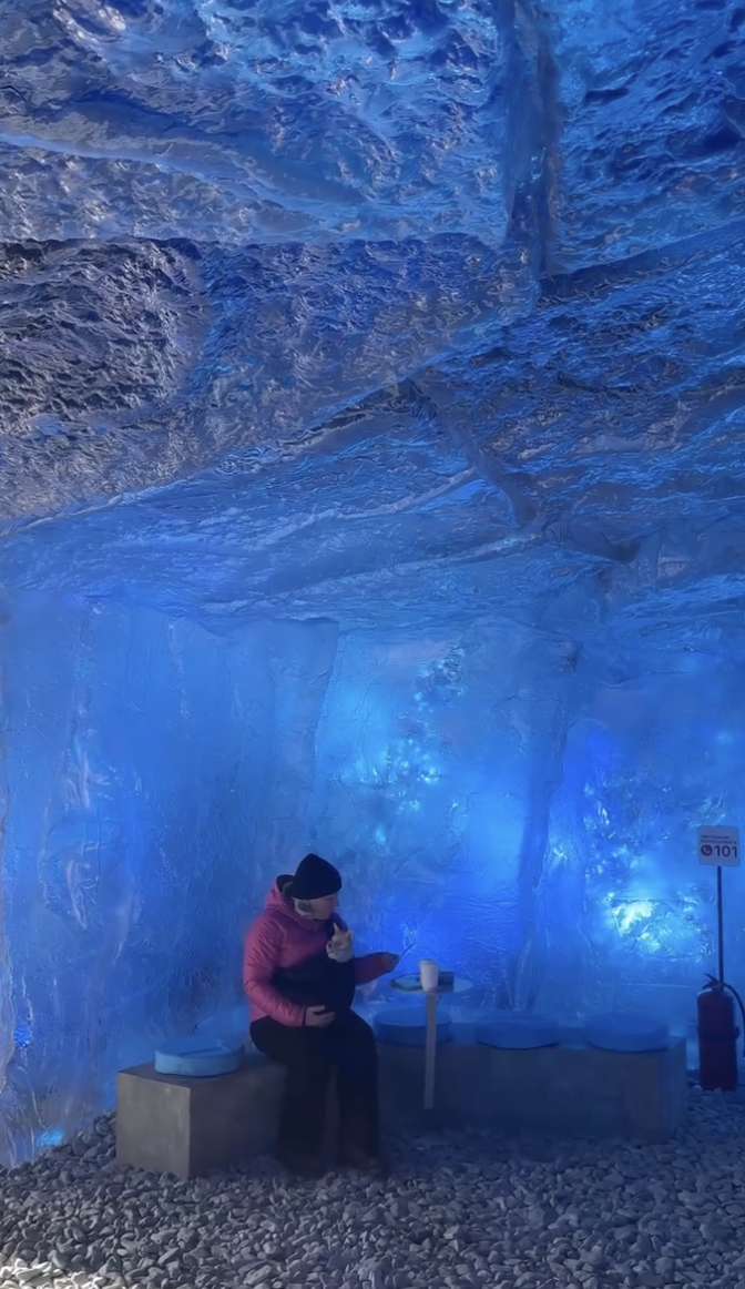 Во-первых, гигантский цветной ледник, где можно бесплатно подзарядить телефон, сделать фото на память и выпить коктейль в ледяном стакане.