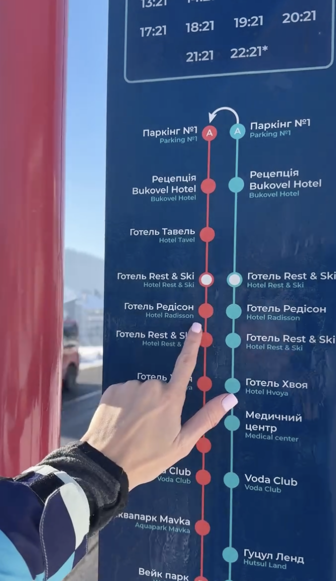 Второе — почасовые автобусы за ноль гривен. Главное — найти остановку. На них можно добраться до подъемников, гостиниц, аквапарка "Мавка".