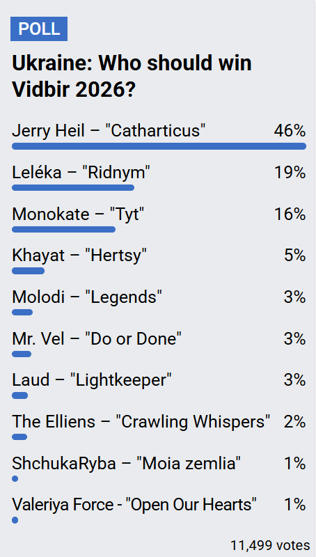 Судя по опросу на сайте Eurovisionworld, победу на Отборе-2026 с большим отрывом пророчат Jerry Heil. Второе и третье место досталось Leléka и Monokate.