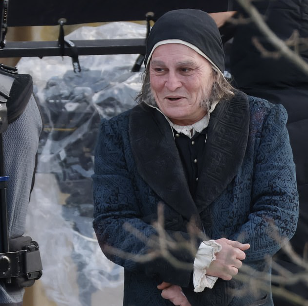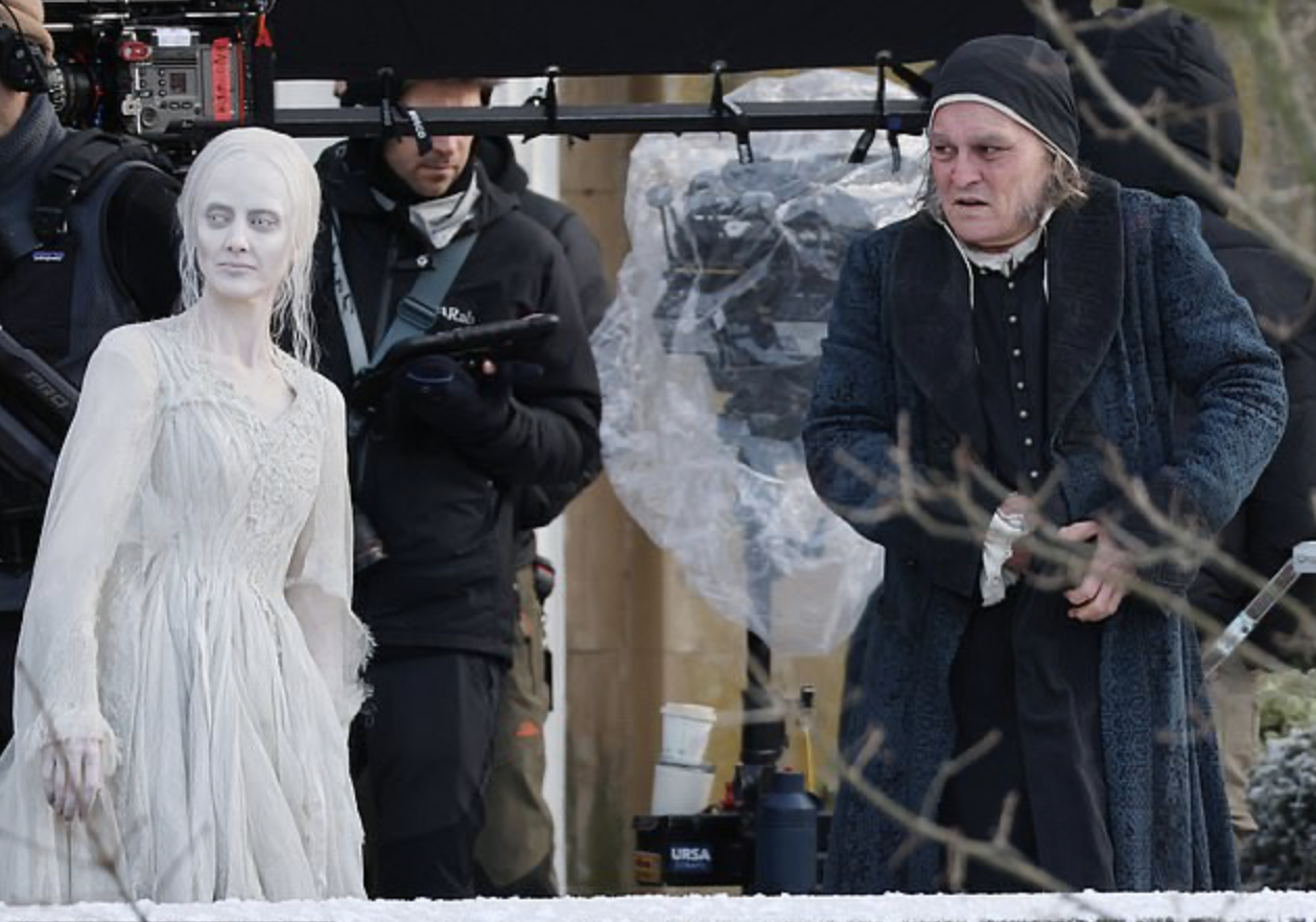 Актер был одет в синее парчовое пальто и черную кепку, а также имел длинные седые бакенбарды. Джонни дрожал и смеялся между дублями вместе со своей коллегой по съемочной площадке Андреа Райзборо.