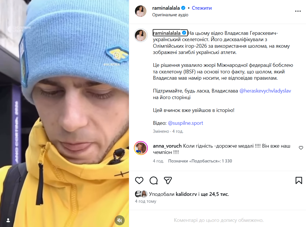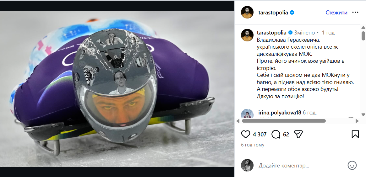 Украинский скелетонист Владислав Гераскевич получил волну публичной поддержки после дисквалификации на Олимпийских играх-2026 в Милане. Причиной решения Международного олимпийского комитета стало намерение спортсмена выступить в шлеме с изображениями украинцев, погибших из-за террористических действий России.