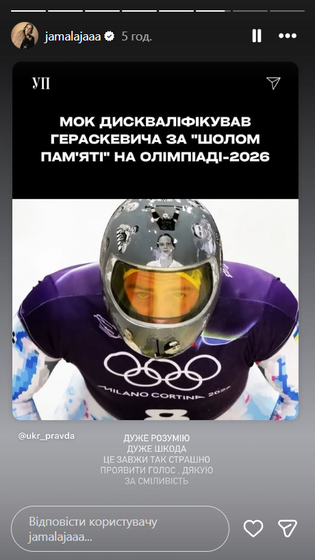 Победительница Евровидения-2016 Джамала также поддержала атлета. Певица отметила, что прекрасно понимает, насколько страшно иногда публично озвучивать свою позицию, и поблагодарила Гераскевича за смелость не молчать.