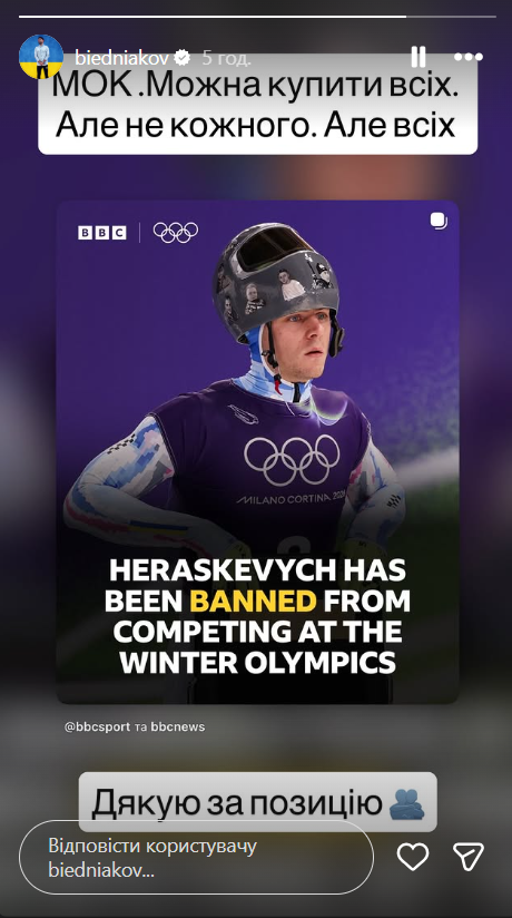Телеведущий Андрей Бедняков поблагодарил спортсмена за твердую позицию и обратился к МОК с саркастическим комментарием: "МОК. Можно купить всех, но не каждого. Но всех".