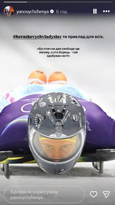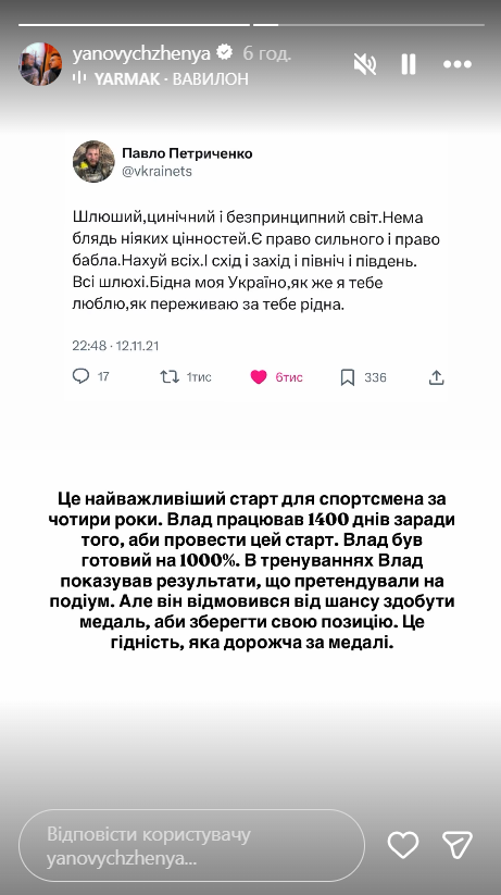 Актер Евгений Янович выбрал более развернутую форму поддержки. Он процитировал строку из "Марша украинских националистов": "Потому что плач не дал свободы еще никому, а кто борец — тот приобретает мир", а затем опубликовал эмоциональное сообщение павшего активиста Павла Петриченко о циничности мира. Проводя параллель с ситуацией вокруг спортсмена, Янович отметил: это был главный старт четырехлетия, к которому Владислав шел 1400 дней и демонстрировал результаты, позволяющие рассчитывать на подиум. Впрочем, по его словам, атлет отказался от возможности получить медаль, чтобы не изменить собственным убеждениям — и именно это достоинство ценнее любой награды.