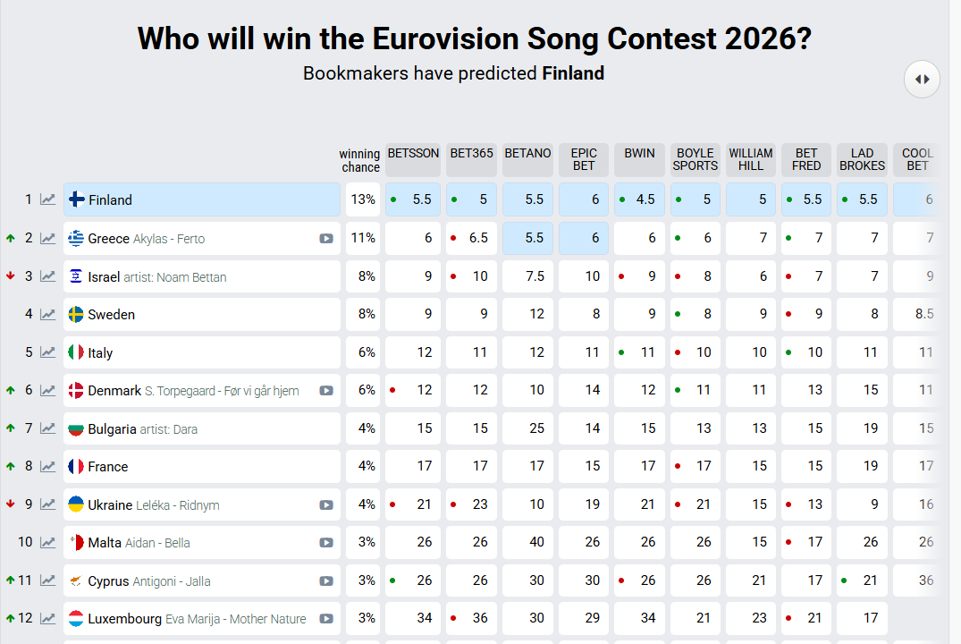 В середине января Украина находилась заметно выше в прогнозах: процент победы равнялся 9%. Впрочем, за последний месяц показатель стабильно снижался. К примеру, в начале февраля речь шла о примерно 6%, а теперь шансы уменьшились до 4%.