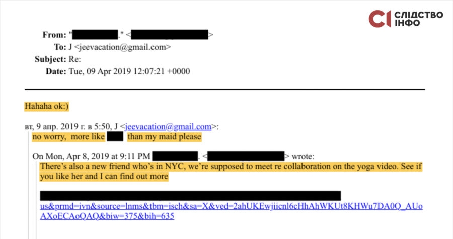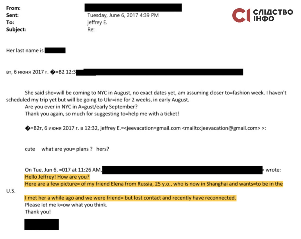 Журналисты установили, что украинка Настя Н. подыскивала девушек по запросу Джеффри Эпштейна, а от него получала авиабилеты в Украину, оплату обучения в Штатах, новый ноутбук и визиты в салон красоты в Нью-Йорке. Также в переписке говорилось о перечислении Насте 10 тысяч долларов США.