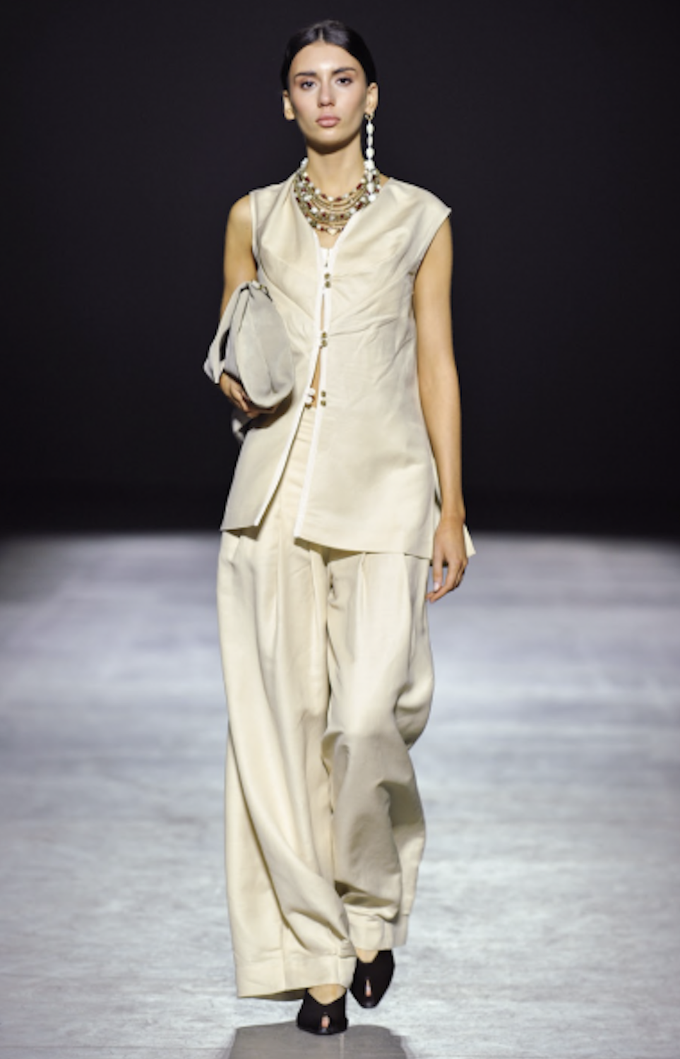 PRZHONSKA превратила показ в трехактный перформанс — от темноты ночи до рассвета. Смена цветов, фактур и силуэтов сопровождалась живым вокалом, который стал эмоциональным проводником этой истории.