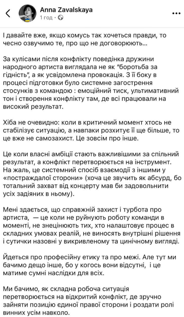 Завальская также заявила, что поведение Репьяховой за кулисами выглядело как провокация: мол, были эмоциональное давление, конфликты и ультимативный тон в общении с командой.