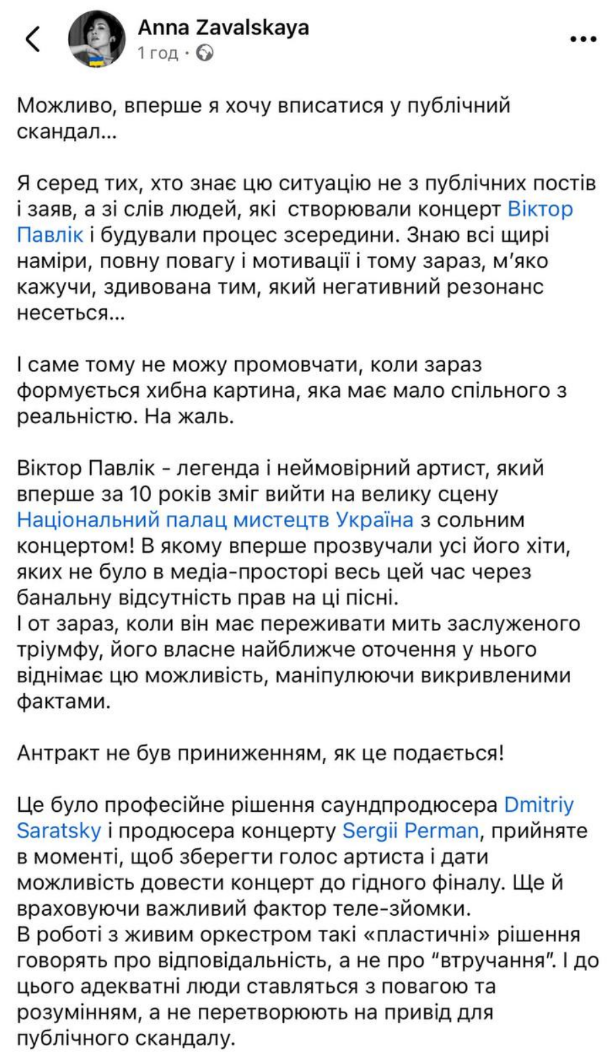 Она также заявляет, что еще до концерта ей запрещали публиковать фото и видео с репетиций, аргументируя это тем, что Павлик "плохо выглядит". Кроме этого, по ее словам, на команду оказывалось давление, а после инцидента некоторые артисты звонили и просили "вступиться" за организаторов.