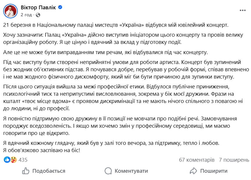 Известный украинский певец Виктор Павлик наконец решил сам расставить все точки над "і" вокруг истории с его концертом. Артист в Facebook не скрывает раздражения: выступление остановили, хотя никаких реальных причин для этого, по его словам, не было.
