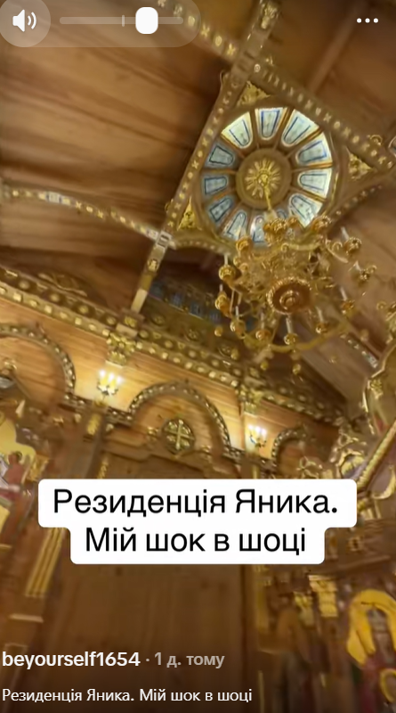 "Я в резиденции Януковича, Межигорье. Мы так ходим, смотрим, я немножко в культурном шоке. Вот такая здесь есть комната. Я не знаю, что вам сказать. Я немного в шоке. Купол, все как надо. Тут батюшка был", — комментирует она.