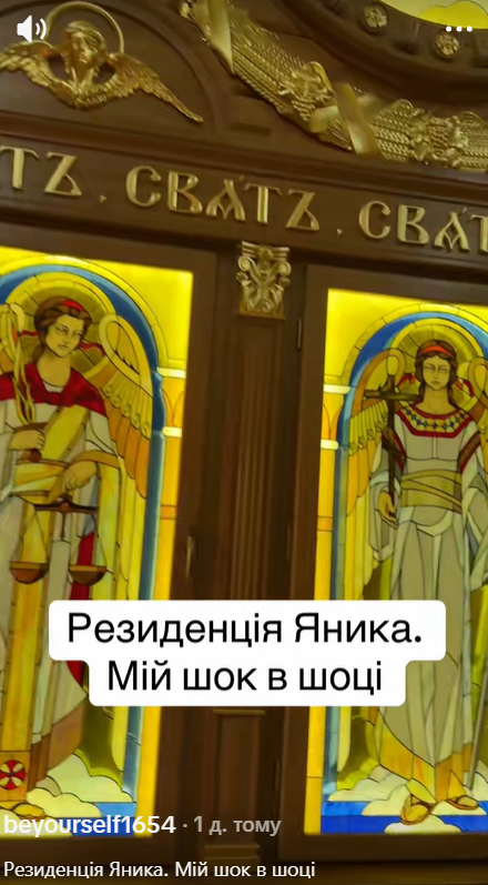 На кадрах видны роскошные интерьеры здания: массивные хрустальные люстры, резные деревянные стены и украшенные иконами залы, напоминающие церковные помещения.