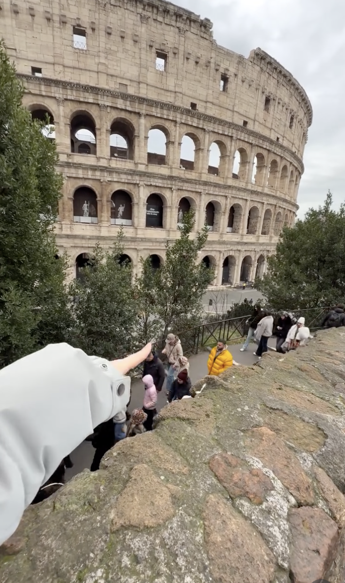 "Меня обокрали возле Колизея. Сейчас я это говорю с улыбкой, но в тот день, когда меня обокрали, я не плакала, я спокойно отреагировала. Немного жаль было потом, когда уже дошло до головы. У меня украли мою коричневую куртку. Это был мой самый любимый зимний пуховик. Его украли, и что самое интересное: вот эта локация, где украли, где я показываю, вот где этот заборчик. Меня фотографировал Виталик и я забрала из его рук, потому что не хотела, чтобы он ее держал. И я поставила на заборчике возле себя куртку", — рассказала автор видео.