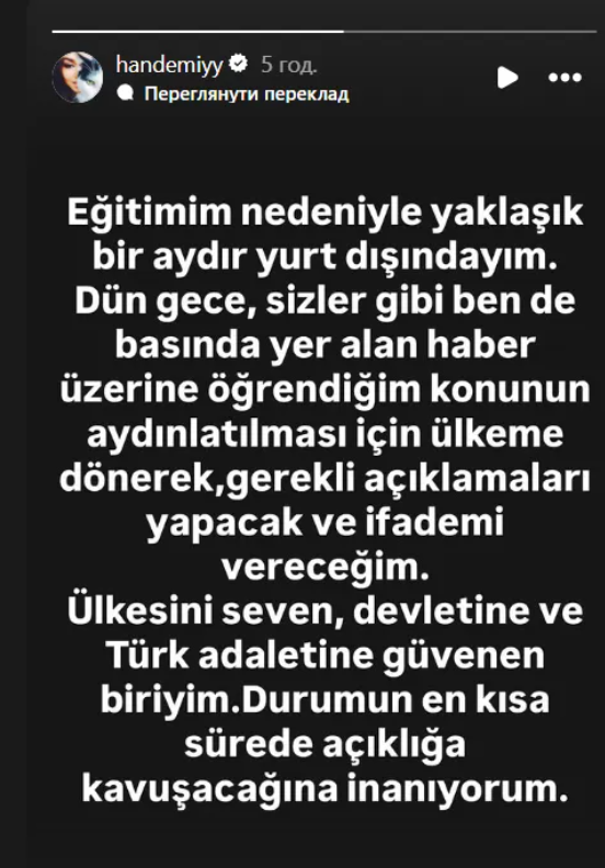 "Я была за границей около месяца из-за учебы. Вчера вечером, как и вы, я узнала об этом из новостей в прессе, и я вернусь в свою страну, чтобы сделать необходимые заявления и дать показания для прояснения ситуации. Я люблю свою страну и доверяю своему правительству и турецкому правосудию. Я верю, что ситуация прояснится как можно скорее", — написала она.