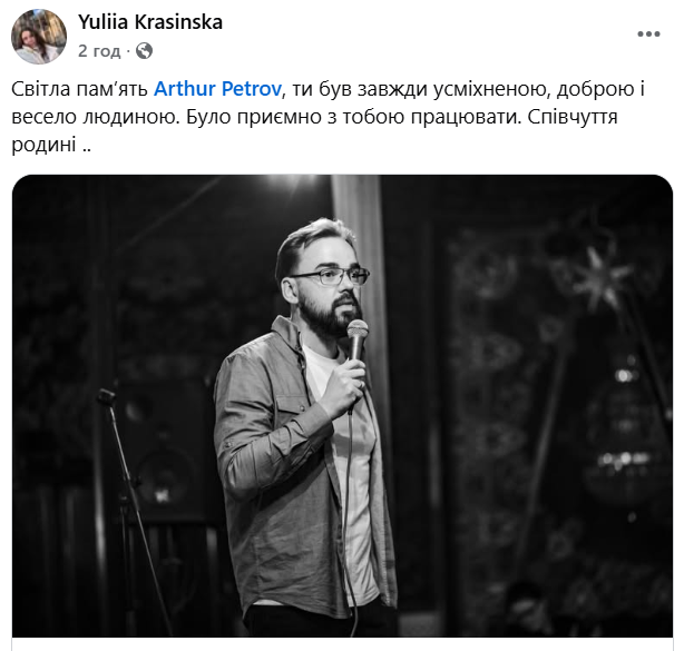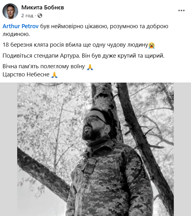 Украинский стендап-комик и военнослужащий Артур Петров погиб на фронте во время выполнения боевого задания. Трагическую весть сообщила его жена.