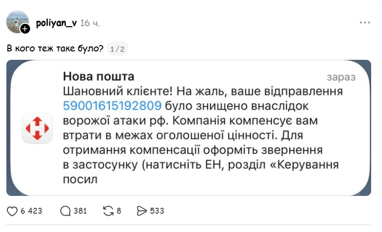 Своим опытом Влад поделился в Threads, добавив скриншоты сообщения от "Новой почты". Там указано, что отправление уничтожено в результате вражеской атаки РФ, а также предоставлены подробные инструкции, как получить компенсацию.