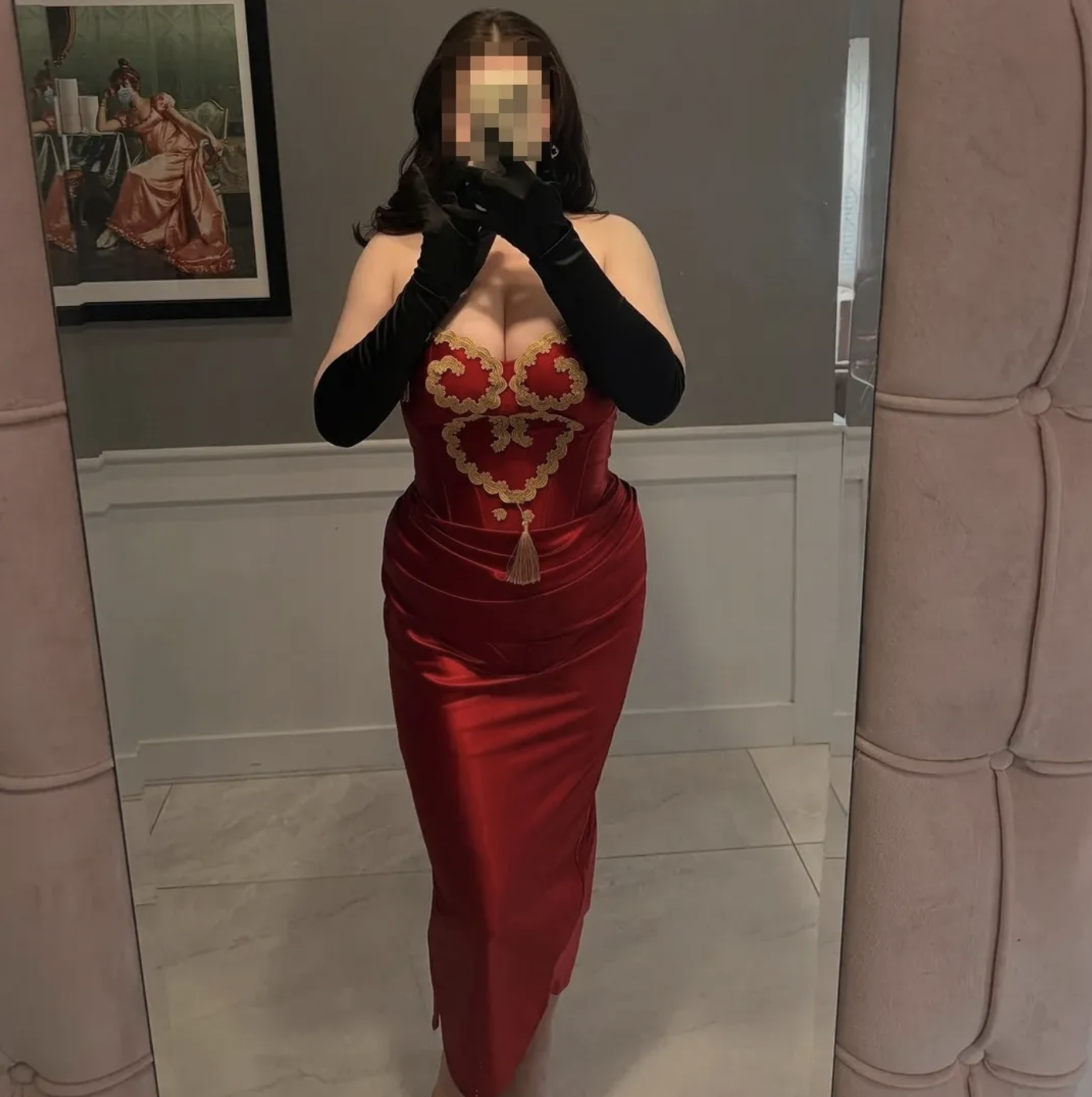 Затем она показала фотографию красного платья, которое облегало фигуру и было с вырезом.