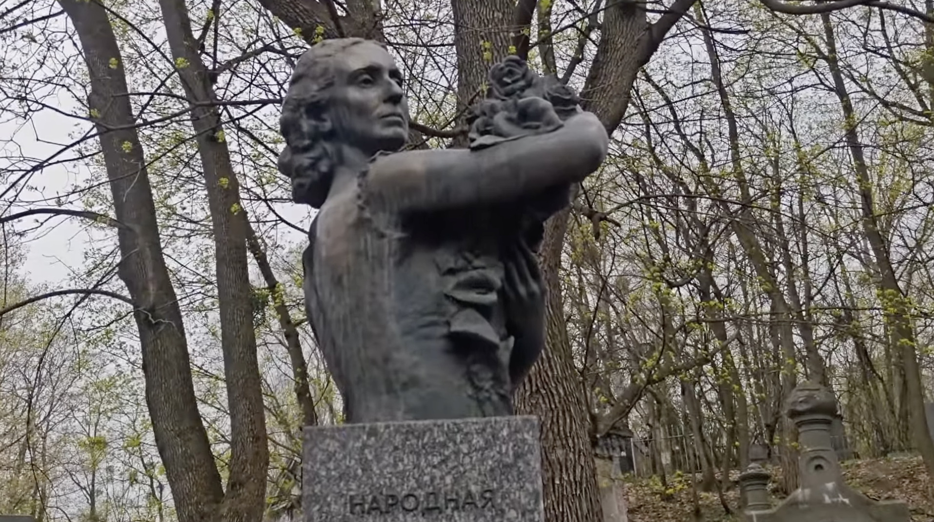На могиле женщины в Киеве установили бюст, где танцовщица держит букет цветов, но пока он покрыт пятнами.
