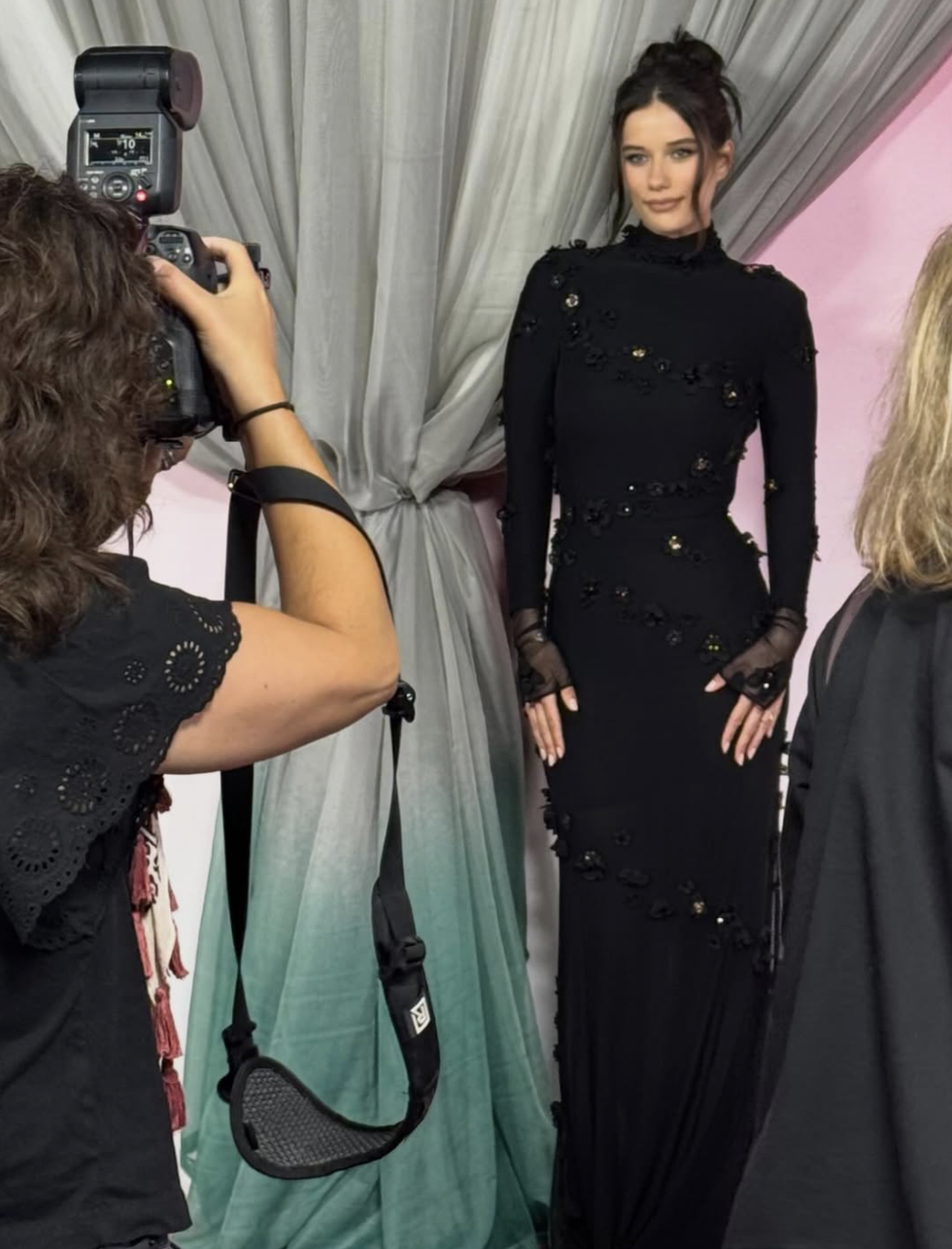 На мероприятие девушка надела черное платье Blumarine с высоким воротником, украшенное цветочной отделкой спереди.