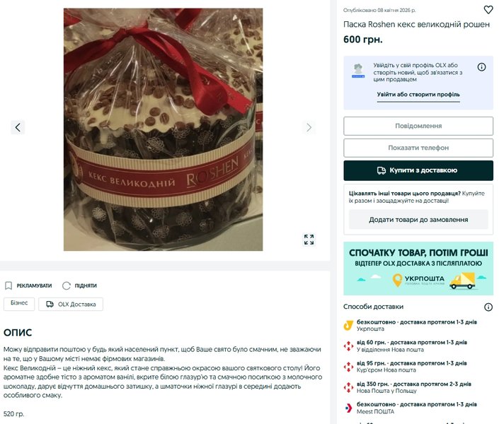 В фирменных магазинах кулич продают за 298 гривен, но на онлайн-платформах его уже перепродают за вдвое более дорогую цену.