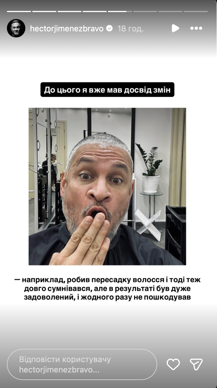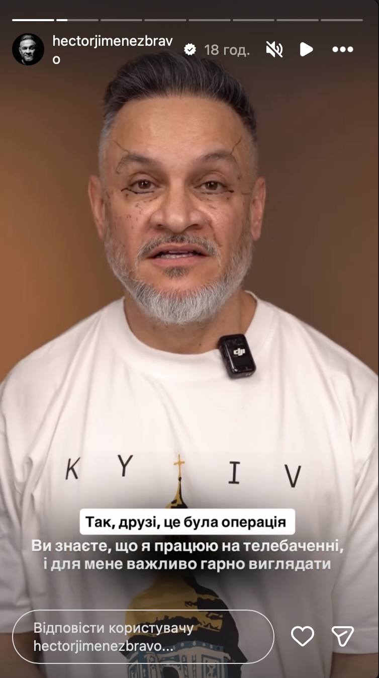 "Да, друзья, это была операция. Вы знаете, что я работаю на телевидении, и для меня важно хорошо выглядеть. Это была блефаропластика — операция на веках. Долго колебался, но все же решил довериться врачам и сделать это для себя", — отметил Хименес-Браво.