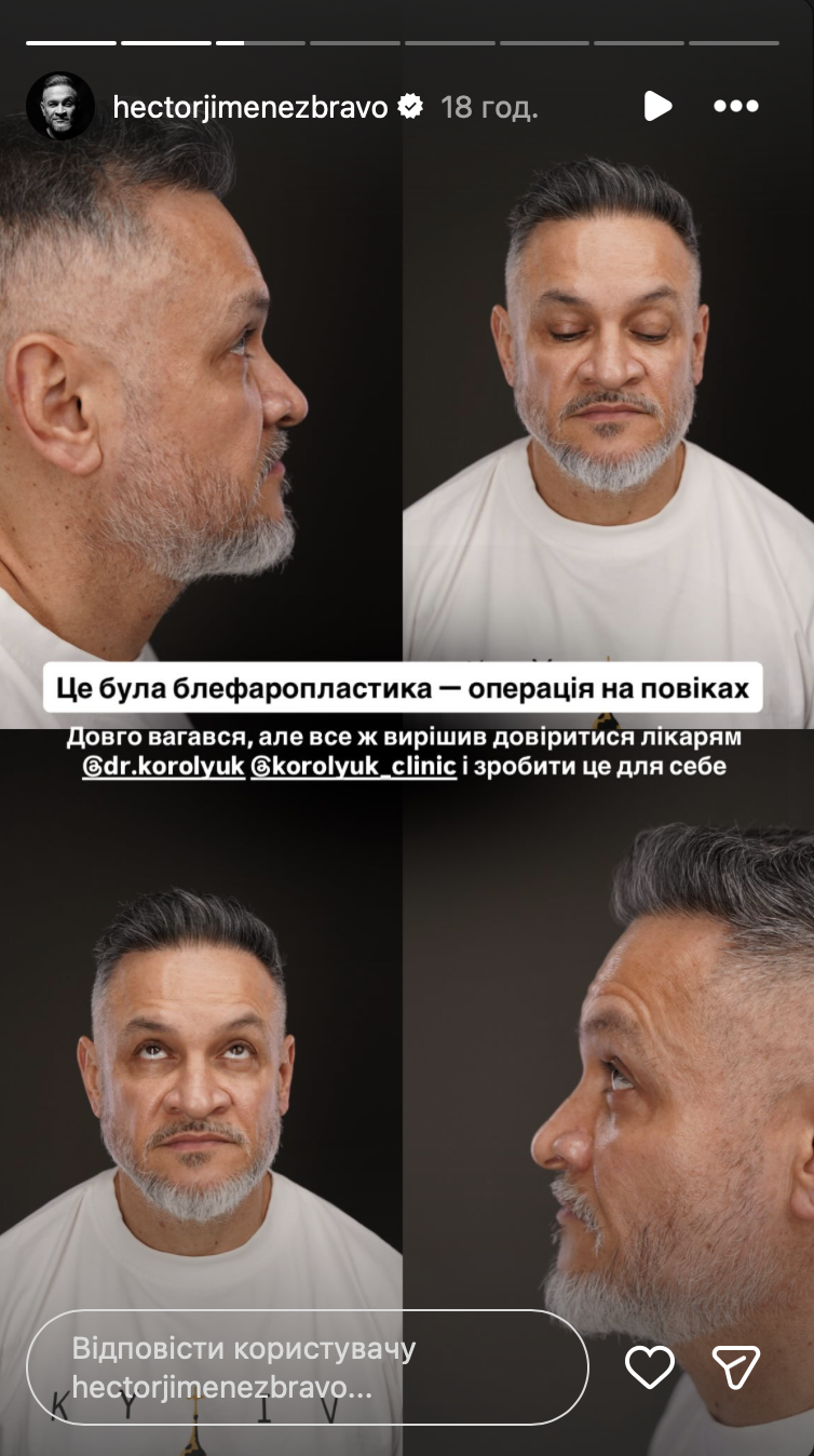 Судья шоу "МастерШеф" поделился в Instagram (hectorjimenezbravo) кадрами из клиники, показав процесс подготовки и реабилитацию после блефаропластики — пластической операции на веках.