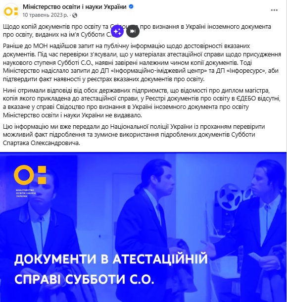 В мае 2023 года в МОН сообщили, что сведений о дипломе магистра Спартака Субботы, копия которого приложена к аттестационному делу, в Реестре документов об образовании в ЕГЭБО нет, а указанное в деле Свидетельство о признании в Украине иностранного документа об образовании ведомство не выдавало.