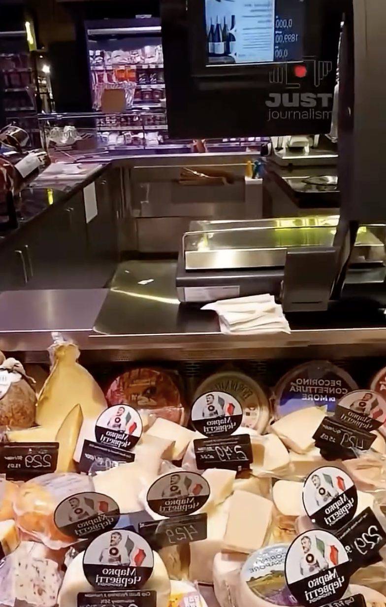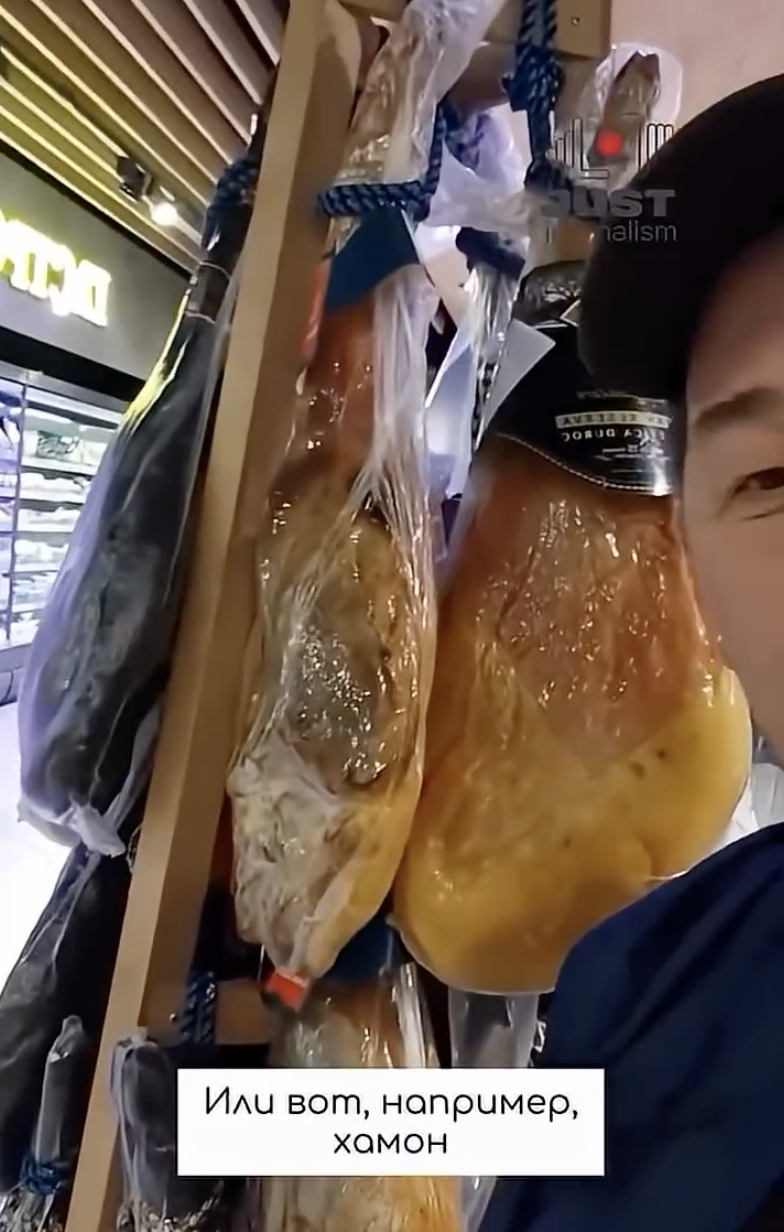 В частности, казах показал хамон, различные виды сыра, большое количество различных колбас, лобстер, устрицы, форель, креветки, крабы.