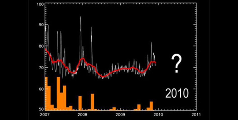 Из анализа длительных рядов данных следует, что солнечная активность впервые коснулась дна в конце 2007 года. Примерно в августе-сентябре поток радиоизлучения достиг самой низкой отметки за период около 10 лет. Примерно в это же время с Солнца пропали солнечные пятна - всего за два три месяца их средняя площадь от 300-500 миллионных долей солнечного диска упала до значений 0-10. Нижней точкой падения стал октябрь-ноябрь 2007 года, когда из 61 дня наблюдений в течение 52 дней на Солнце вообще не было пятен. По видимому, именно этот момент можно считать началом текущего исторического спада солнечной активности, в котором наша звезда находится, таким образом, уже 25 месяцев.