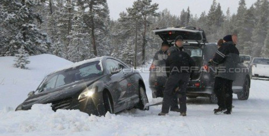 После неудачных попыток самостоятельно выбраться из снежного плена водитель купе вынужден был обратиться за помощью к своим коллегам, которые в это же время неподалеку проводили тестирование нового поколения кроссовера Mercedes-Benz ML-класса.