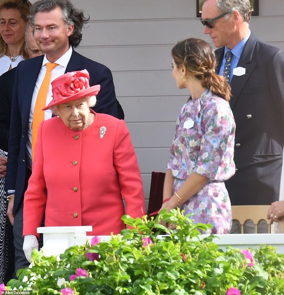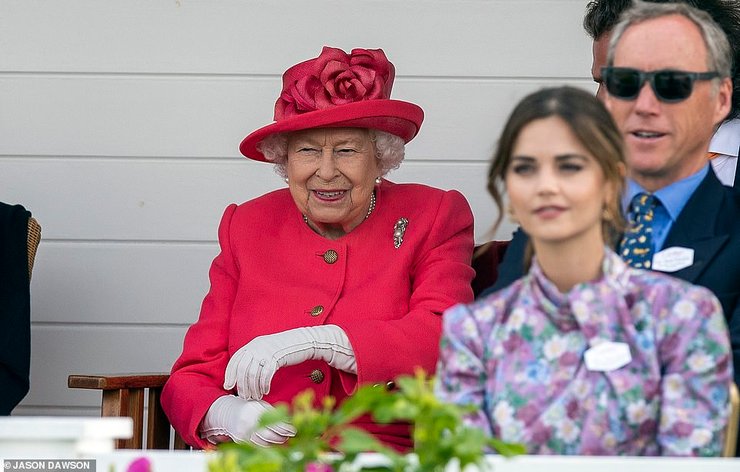 Ради поло Елизавета II оделась ярко, в пальто кораллового цвета. Наряд дополнила такого же оттенка шляпкой с огромной розой, белыми перчатками и жемчужными украшениями.