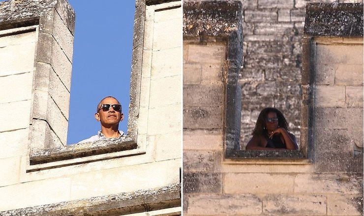 Несмотря на охрану, папарации удалось заснять, как 44-й президент смотрит с крепостной стены между зубцами.