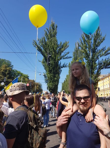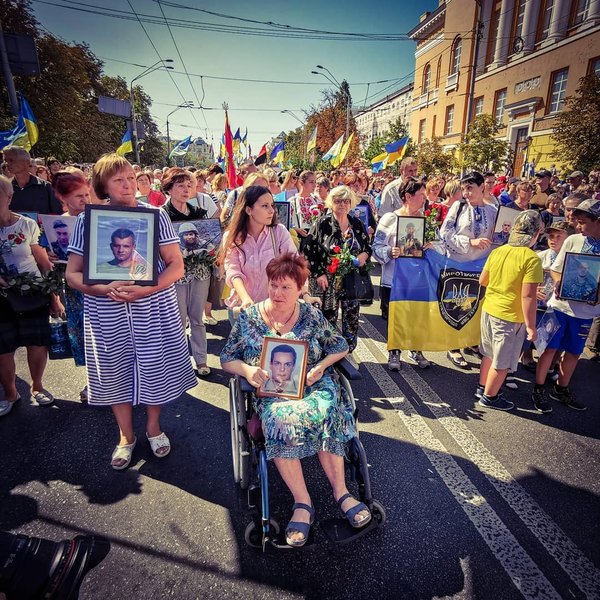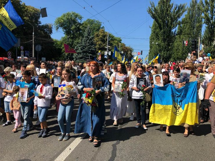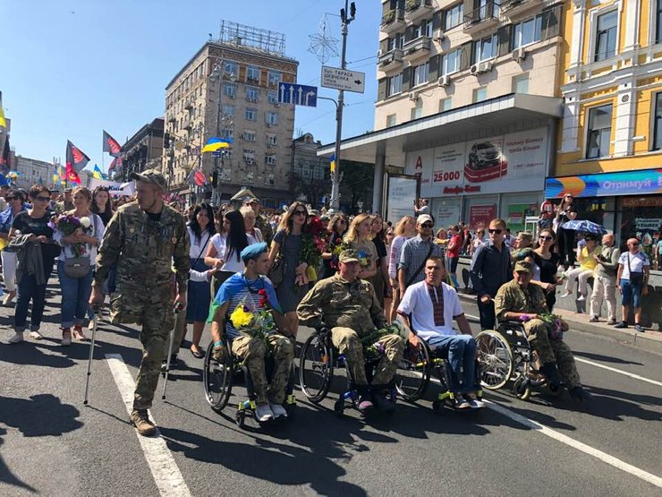 В первых колоннах стояли родственники Героев Небесной сотни и погибших на Донбассе бойцов, а также получившие на войне ранения бойцы.