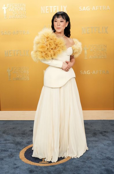 43-летняя американская актриса Али Ан "("Миллиарды", "Оранжевый — хит сезона", "Воспитывая Дион", "Дипломат", "Агата все время") появилась на красной дорожке в платье от лейбла высокой моды Ashi Studio, которым руководит парижский дизайнер Махаммед Аши. Он создал для нее скульптурный образ, состоящий из скульптурного топа с одним рукавом и шифоновой юбки кремового цвета. Особенно привлекала внимание отделка на плечах актрисы, которая напоминала не то репей, то ли плюшевых мишек, хаотично прикрепленных к топу. Платье, которое должно было выглядеть как модный риск, стало одним из самых провальных на мероприятии.