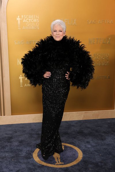 66-летняя американская актриса Джейми Ли Кертис позировала на красной дорожке в черном платье с пайетками от Dolce & Gabbana с эффектным верхом из перьев. Они каскадом ниспадали вниз по обеим рукам, образуя длинные рукава и обрамляя ее лицо. Кертис позволила облегающему наряду говорить за себя, дополнив его только серебряными и черными серьги-гвоздиками от Cathy Waterman.
