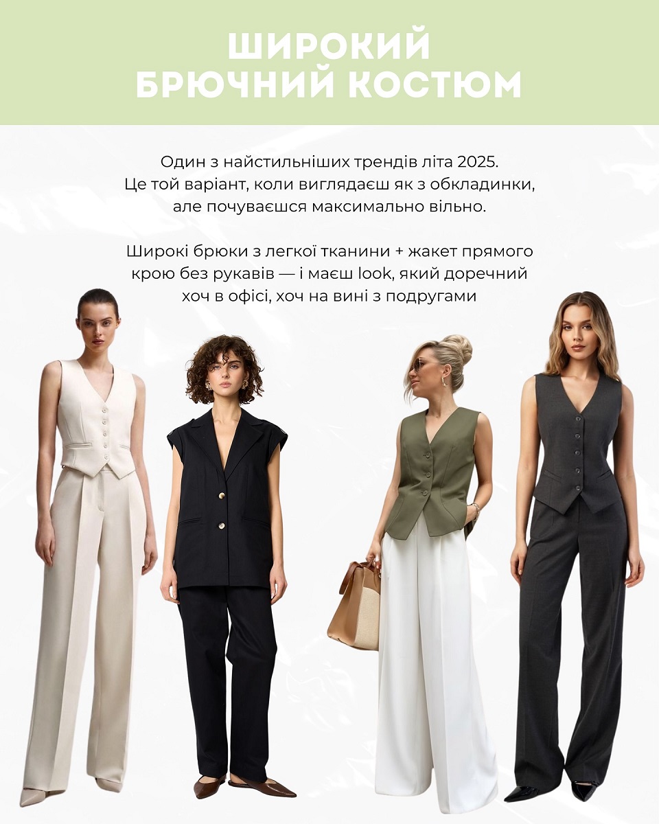 "Широкие брюки прямого кроя и жакет прямого кроя без рукавов – и получаешь look, который уместен хоть в офисе, хоть на вино с подругами", – говорит Андре Тан.