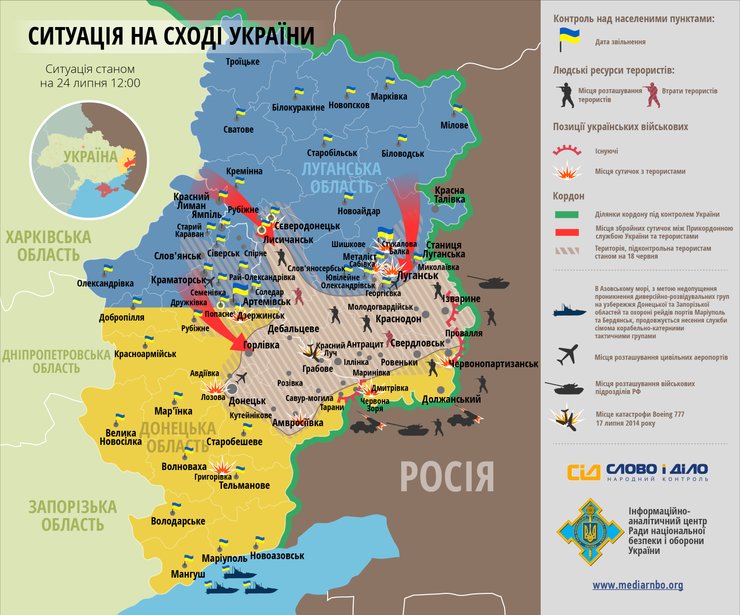 Сейчас в зоне антитеррористической операции идут наступательные бои за освобождение Лисичанска. Террористы заблокированы в городе, им отрезаны пути к отступлению.