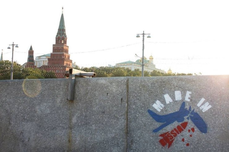 На улицах Москвы можно увидеть и трафареты, на которых изображено, как российская ракета сбивает самолет.