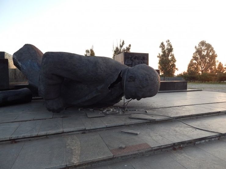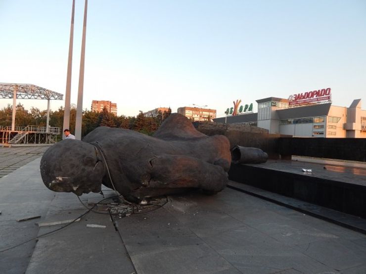 Самый большой в Мариуполе памятник Ленину стащили с постамента, набросив металлический трос.